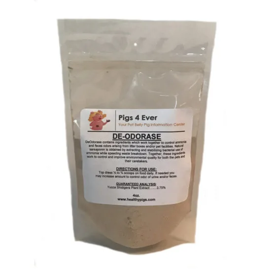 DeOdorase is a feed supplement that when added to the top of your pet pigs feed will help to control ammonia odors in urine and feces.